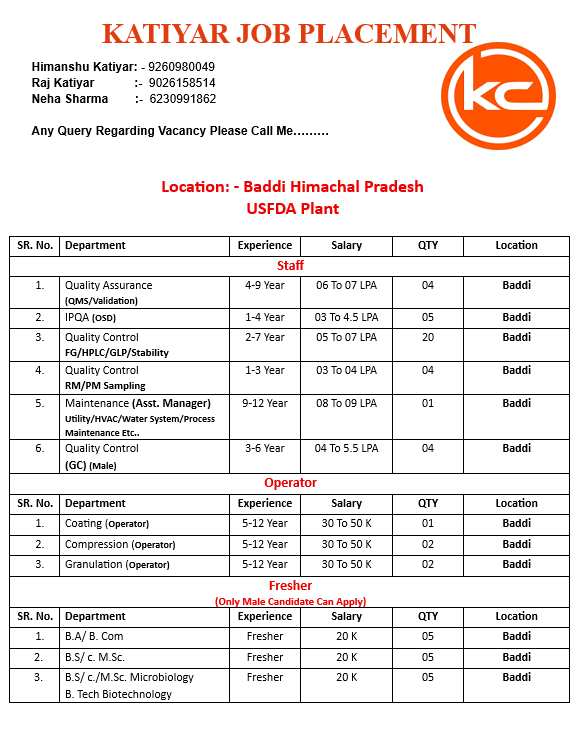 Katiyar Job Placement is offering excellent pharmaceutical job opportunities in Baddi, Himachal Pradesh, at a USFDA approved manufacturing plant. Candidates with experience as well as freshers can apply for multiple positions across Quality Assurance, Quality Control, Production, Maintenance, and Operator roles.